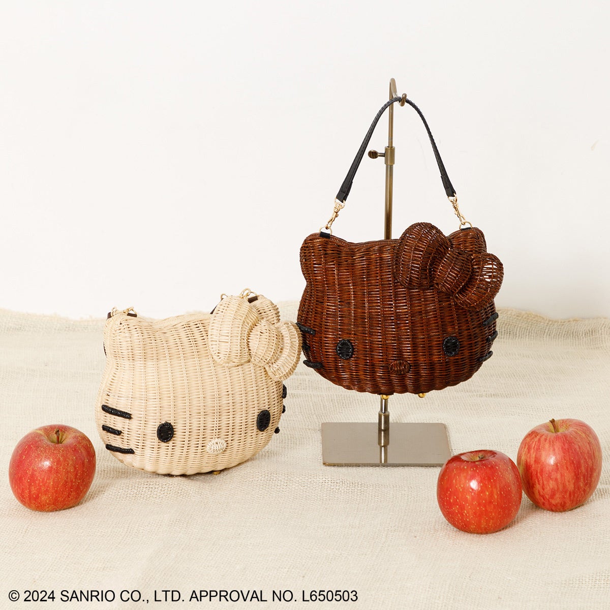 右:<アコモデ> ハローキティ ラタンバッグ ①ナチュラル ②ブラウン 各25,300円 (本体:ラタン/ストラップ:PVC・合成皮革/約タテ18×ヨコ 20×マチ10cm/ショートストラップ:24cm・ロングストラップ: 90cm)