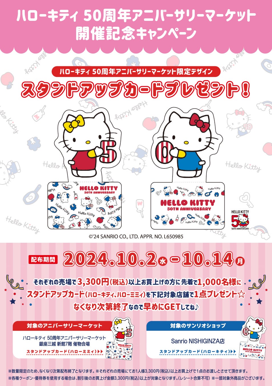 期間中、下記の対象店舗にて商品を3,300円以上お買いあげいただいた先着1,000名さまに Hello Kitty 50th Anniversary Market 限定デザイン「スタンド アップカード」1枚をプレゼントいたします。※店舗によりデザインが異なります。