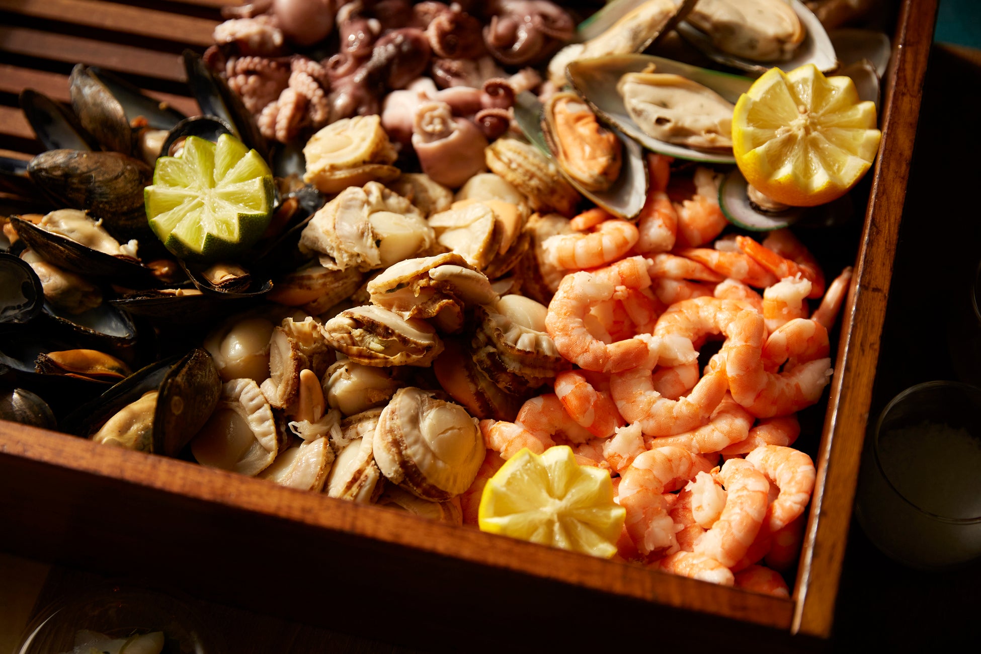 肉本来の旨味を活かした国産牛のローストビーフと、海老、帆立、ムール貝など海の幸を心ゆくまで堪能