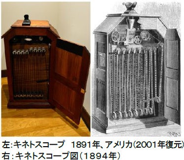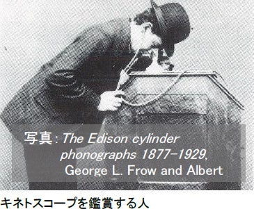発明王トーマス・エジソンが1891年に特許を申請した動く映像を見るための装置です。大勢でスクリーンに映写される動画を見るのではなく、ひとりずつ個別に箱の中を覗いて見ます。