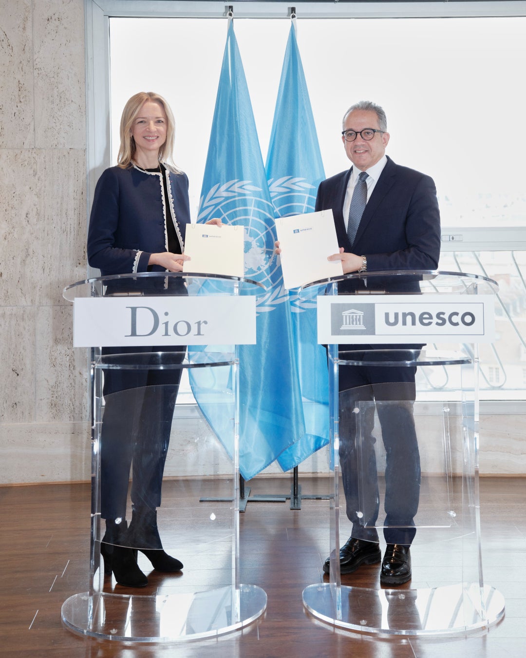 この機会に、クリスチャン・ディオール・クチュールの会長兼CEOであり、LVMH取締役会および執行委員会のメンバーでもあるデルフィーヌ・アルノーと、ユネスコの事務局長であるカレド・エル・エナニーが会談し、このユニークなパートナーシップの更新に署名しました。「Women@Dior & UNESCO」*のメンティーたちが同席し、自身の経験を共有し、プログラムでの経験を振り返るとともに、クリエイティブなリーダーシップから社会的持続可能性、そして技術の継承に至るまで、未来に必要なスキルについて対話を交わしました。