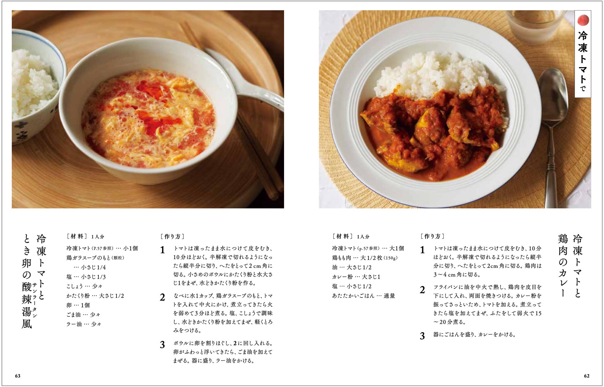また、野菜によってはスーパーのパックに入れたままで冷凍できるものも多数あるとのこと。本書でも、実は冷凍にとても向いているという丸ごと冷凍トマトを使ったカレーやスープのレシピを紹介しています。