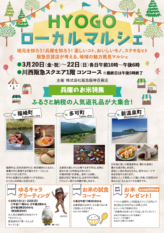 兵庫県は大きく、関西にお住まいの方にもまだ知られていない魅力がたくさん詰まった県。そんな兵庫県の中の3つの町にスポットをあて、現地の方や生産者と直接触れ合うことができる、地域の魅力発見イベント「HYOGOローカルマルシェ」を川西阪急スクエアにて初開催いたします。ふるさと納税の人気返礼品を実際に試して購入できるコーナーや、人気のゆるキャラも登場!地元だけど意外と知らない…そんな兵庫の魅力に触れることのできるイベントです。
