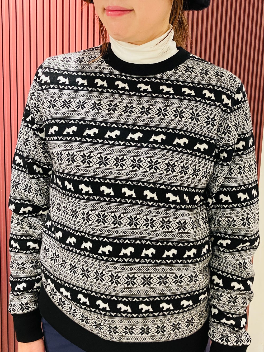 ホリデーシーズンを彩るノルディック柄の防風裏地付きニット。アイコンのヘンリー君がシルエットで編み込まれており、ハイゲージで防風裏地付きですが重くなく、シルエットもすっきり見せてくれます。ギフトにもおすすめです!