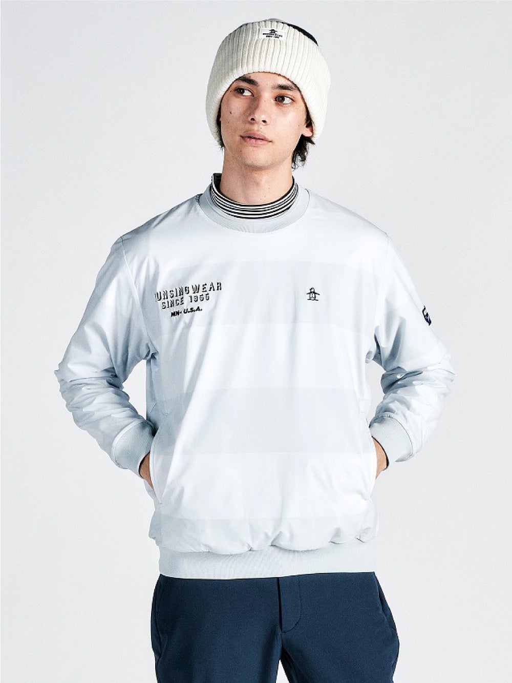 表面には、撥水、ストレッチ機能を備えた生地にボーダープリントを施し、裏面にはストレッチ機能を有するフリースを用いた二つの顔が楽しめるリバーシブルアウター。表面のマーキングは刺繍、裏面フリースの胸のロゴはエンボスで表現しています。