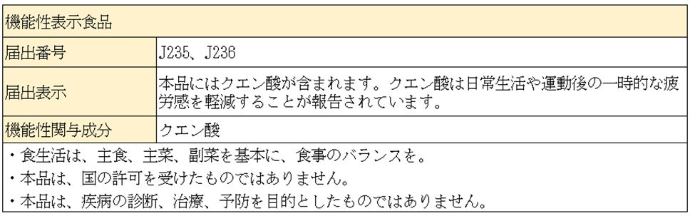 コップ2杯(360ml)当り、 レモン2個分の果汁(約60ml)とクエン酸が2700mg入った、 クエン酸の働きで日常生活や運動後の一時的な疲労感を軽減できる、 機能性表示食品のレモン飲料です。 |
