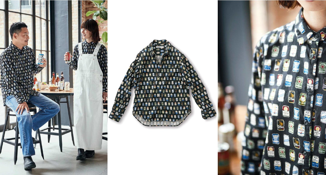 世界中の缶ビールコレクターになったような気分を味わえるシャツです。ほどよい厚みの綿ツイルで仕立てたシンプルなシャツなので、ビールと同じくオールシーズン活躍します。世界各国にありそうな缶ビールを想像した、オリジナル缶が8種類描かれています。