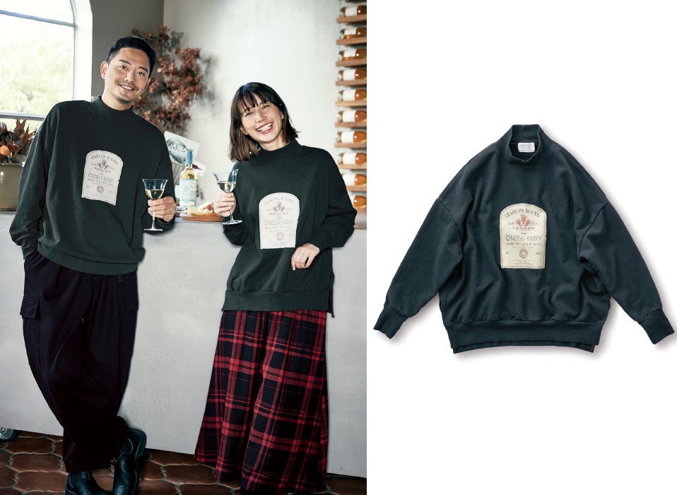 ヴィンテージワインのボトルラベルをイメージしたプリントを胸もとにあしらったトレーナーです。熟成され味に深みが増していくワインボトルのような深緑色で、ドロップショルダーなのでゆったりと着用できます。