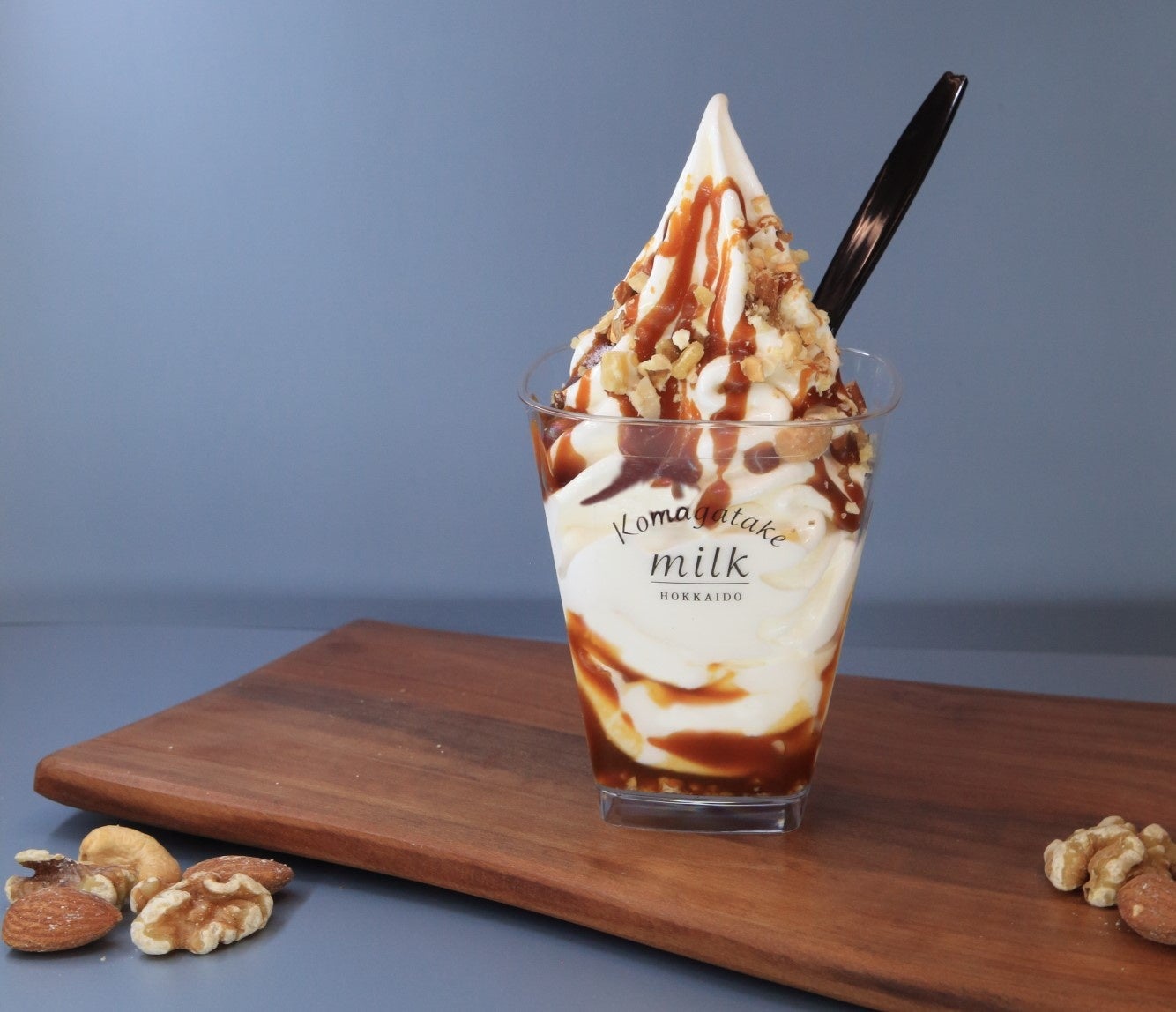 濃厚な北海道キャラメルソースとザクザクナッツが香ばしいソフトクリーム。