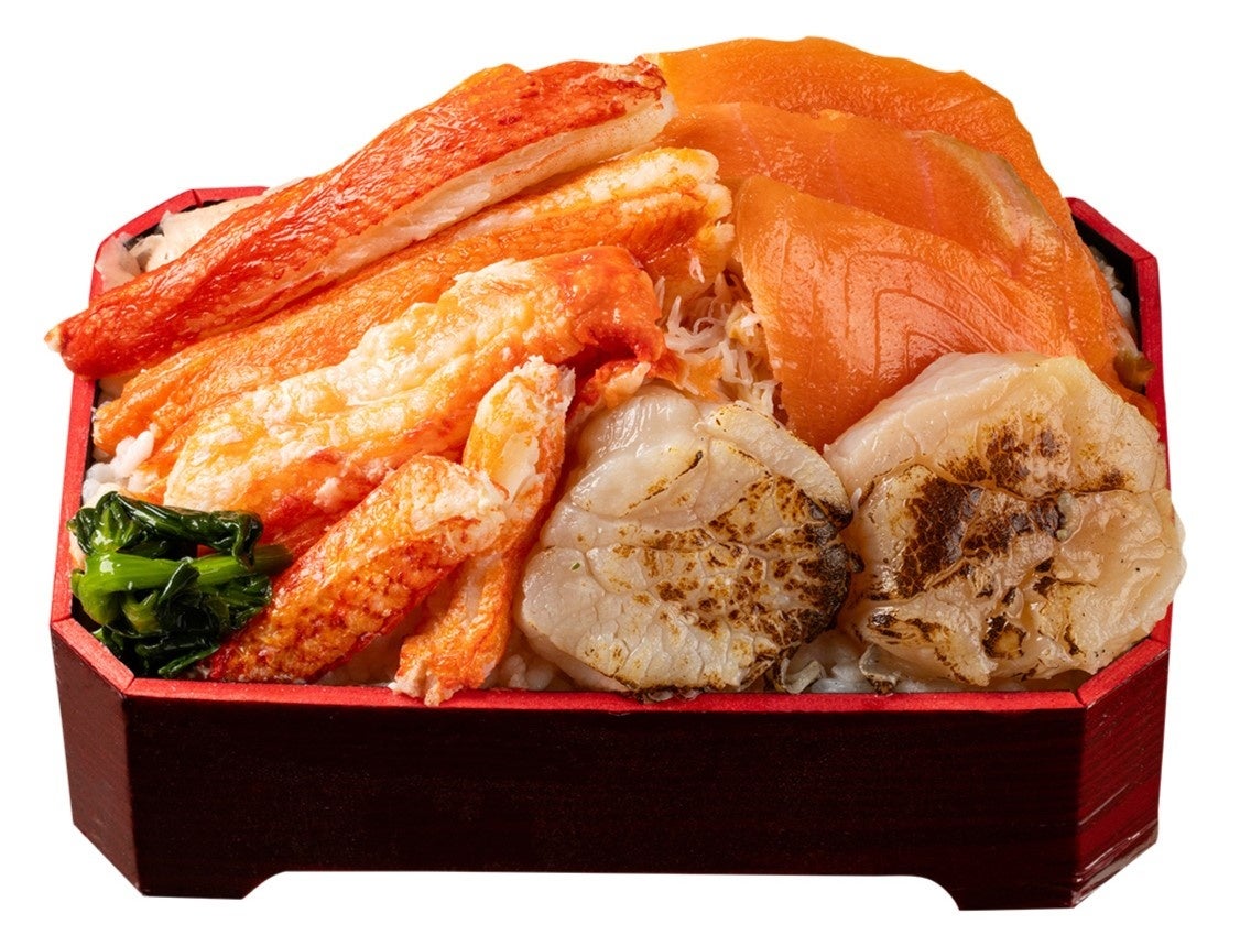 タラバガニ、ズワイガニ、毛ガニの3大蟹や大粒のほたてなどを盛り付けたメガ盛り弁当。