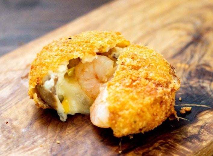 グラタンコロッケにペーストにした、じゃがいもの甘味をプラス。ぷりっぷりのえびの食感を楽しめます。