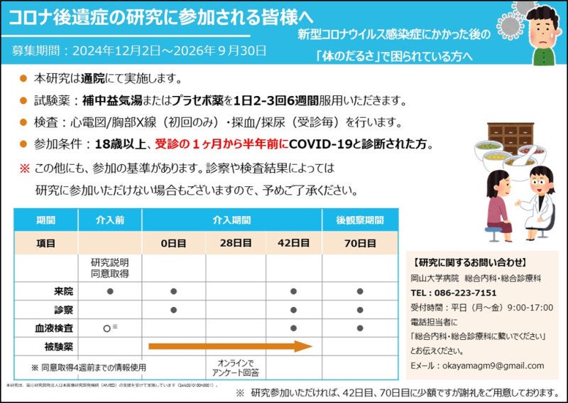国立大学法人岡山大学(本部:岡山市北区、学長:那須保友)の岡山大学病院総合内科・総合診療科の徳増一樹研究准教授と岡山大学学術研究院医歯薬学域(医)総合内科学の大塚文男教授らのチームは、国立研究開発法人日本医療研究開発機構(AMED)の委託を受けて、新型コロナウイルス罹患後症状(以下、コロナ後遺症)の「体のだるさ」で困っている患者さんを対象に2024年12月から臨床研究を開始しました。募集期間は2026年9月末までです。