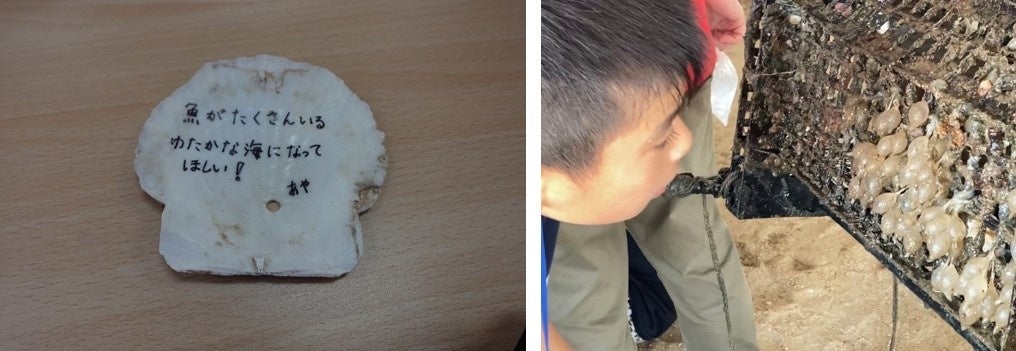 解体後は、自分たちで組み直して、魚礁内に入れる貝に一人一人が海のメッセージを加えて、再び海に返しました。子どもたちは楽しみながら取り組みつつも、豊かな海をつくるために人間も貢献できることを学びました。また、自分自身も海を豊かにする活動へ貢献していることを実感して嬉しそうな様子でした。