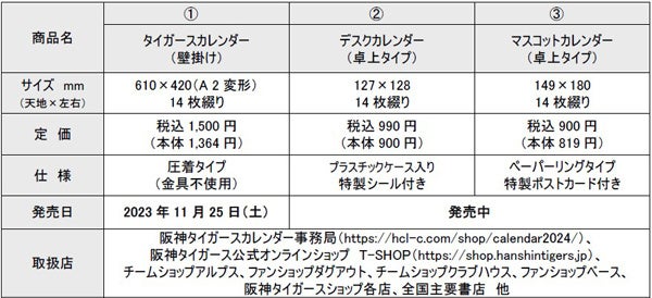 なお、「阪神タイガース デスクカレンダー 2024(卓上タイプ)」、「阪神タイガース マスコットカレンダー 2024(卓上タイプ)」は好評発売中です。