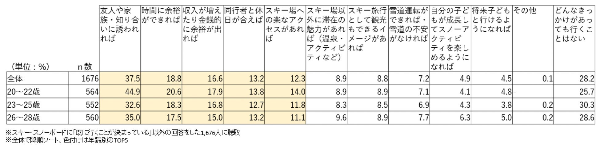 若年層全体(20~28歳)では、約46%がスキー・スノーボードへ「既に行くことが決まっている」「行きたいと思っている」「機会があれば行きたいと思っている」と回答し、半数近い人々に実施意向があることが分かりました。一方で、「行きたいと思っている」「機会があれば行きたいと思っている」割合は、世代があがるごとに低下していました。また、スキー・スノーボードを実施したことがある人のうち、「行く予定はない」と回答した人に行かない理由を聞いたところ、「一緒に行く同行者がいない」(27.1%)、「金銭的に余裕がない」(25.8%)という結果でした。