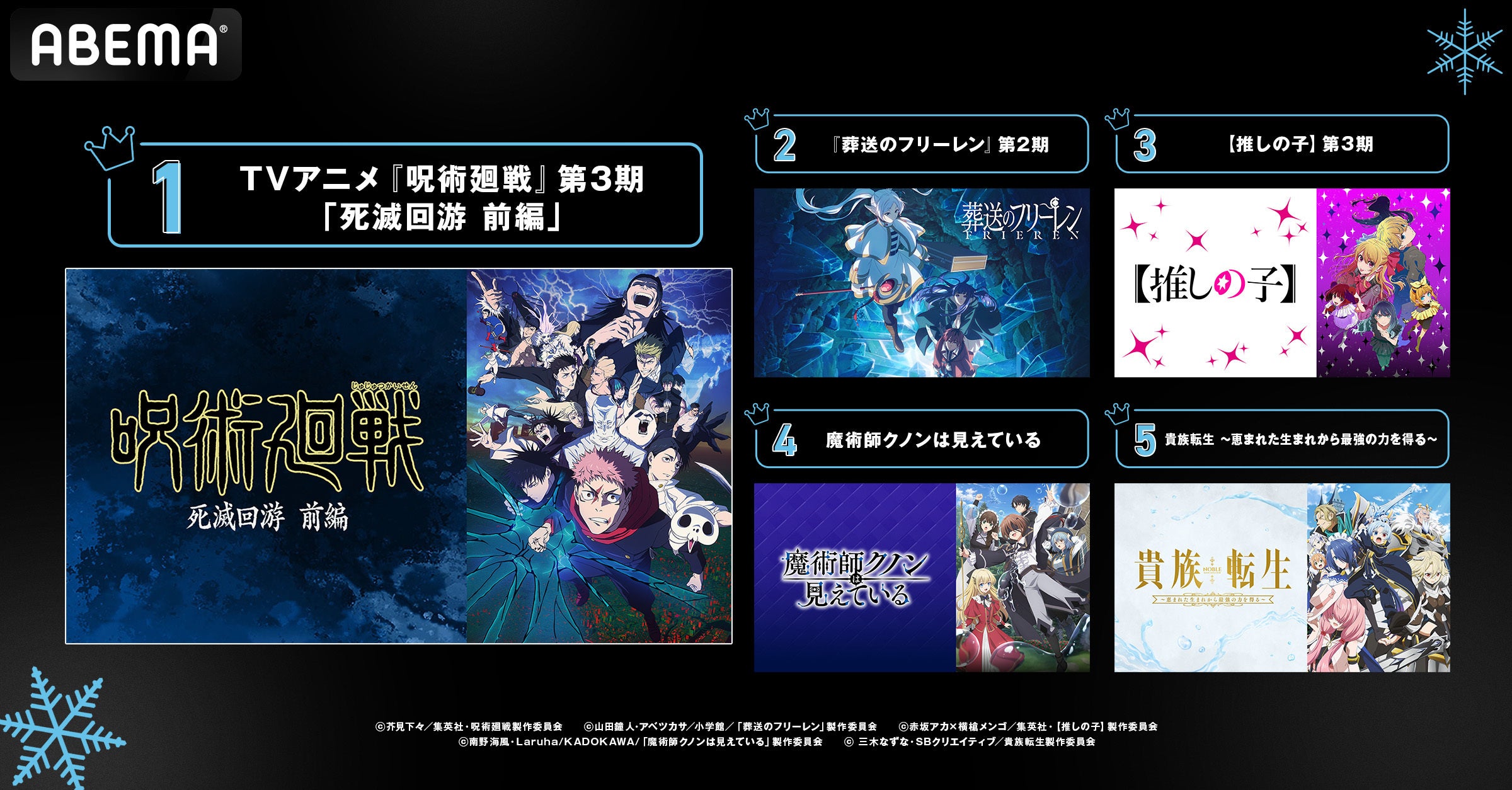 2026年、新作冬アニメの「ABEMA」中間ランキングを発表!再生数はTVアニメ『呪術廻戦』、コメント数は『葬送のフリーレン』が首位に!