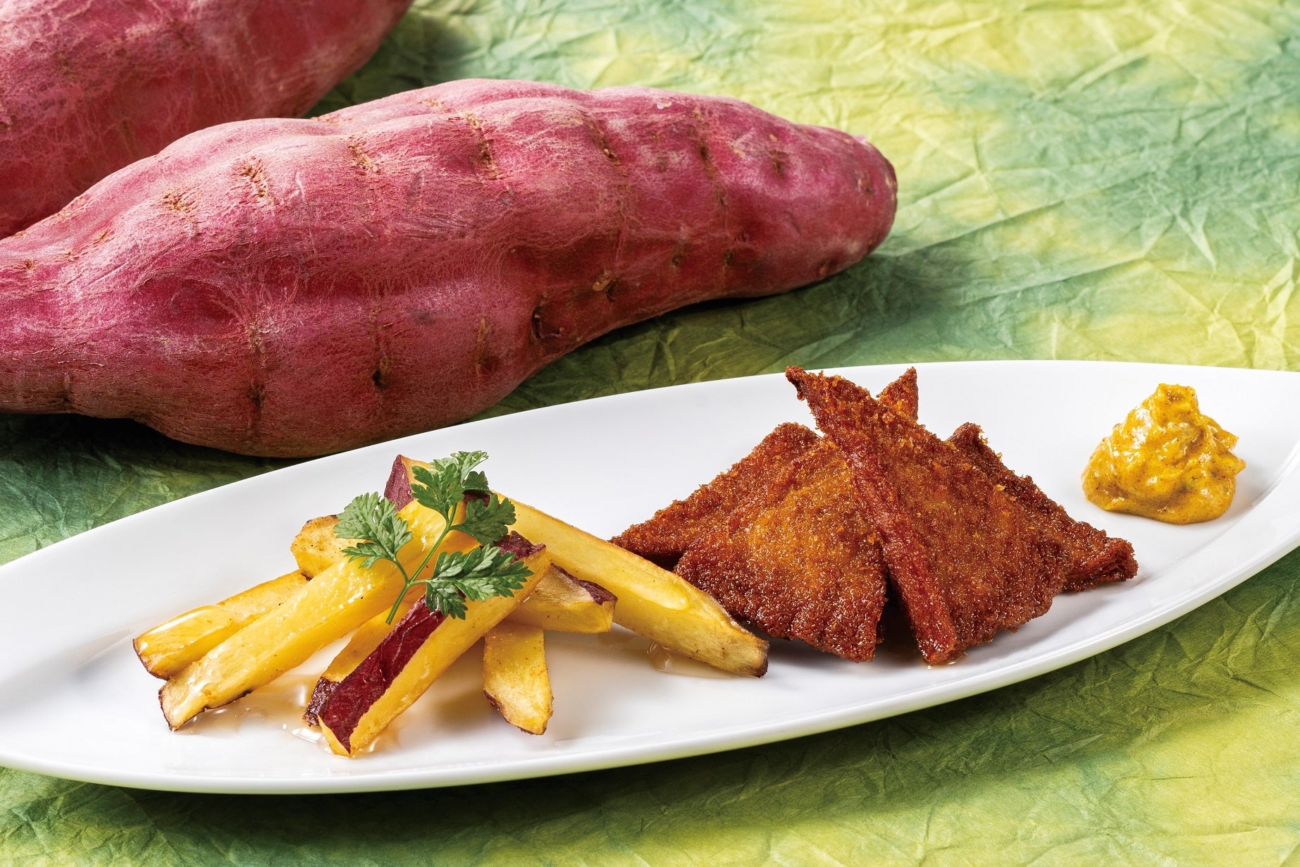 白身魚のすり身にカレー粉などの調味料を加えパン粉をまぶして揚げる、徳島のソウルフード「フィッシュカツ」。徳島特産の「なると金時」を添えて “フィッシュ&チップス”スタイルにしました。