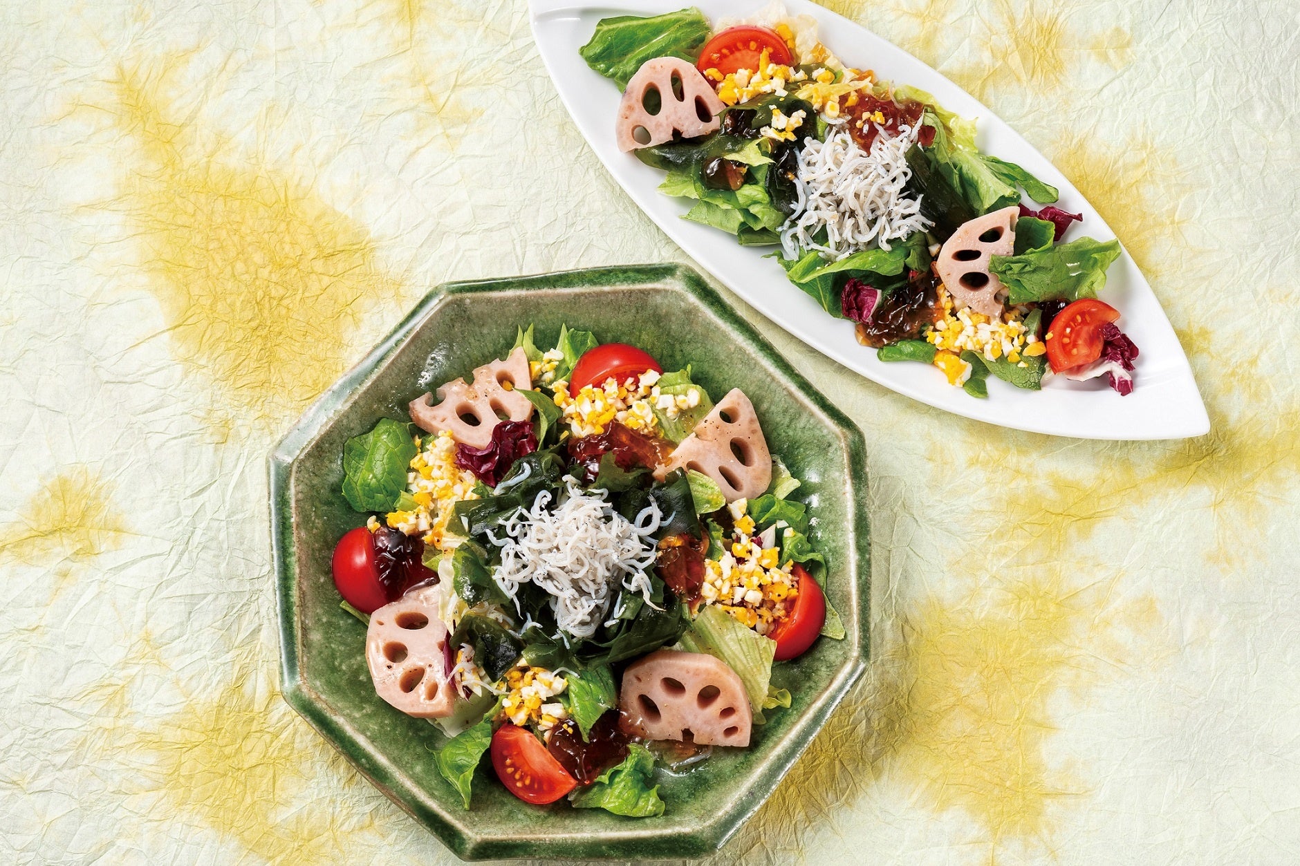 徳島特産「ももりこトマト」「コウノトリれんこん」「鳴門わかめ」に「徳島しらす」をトッピングした、徳島の恵みを堪能できるサラダに仕上げました。