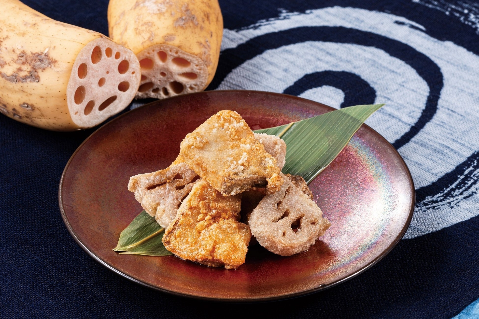 料理の撮影には、徳島の伝統工芸品である阿波和紙と、徳島でつくられる天然藍染料「阿波藍」で染められた藍染の風呂敷を使用し徳島の風情を添えました。