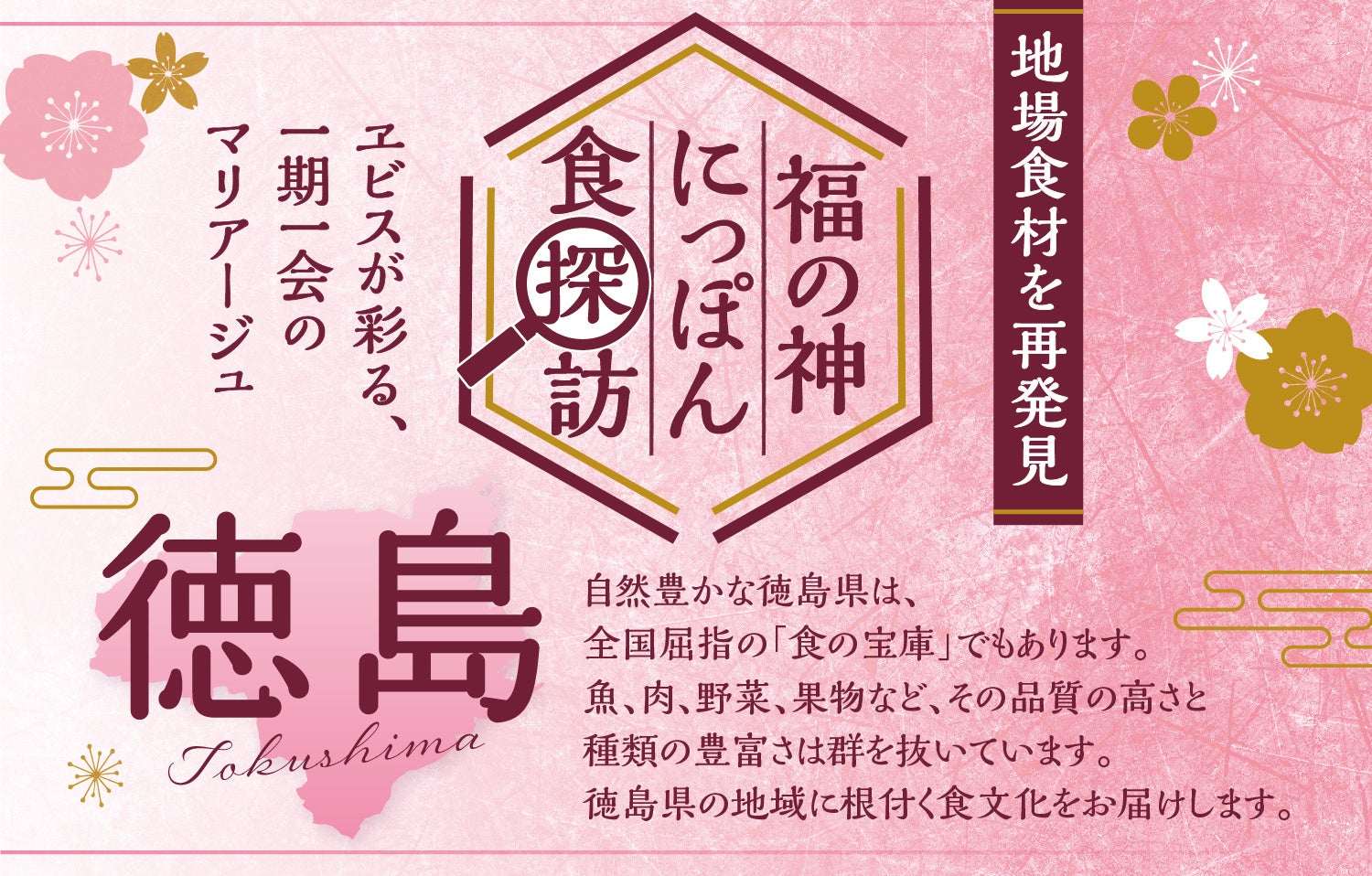 個性豊かな樽生ヱビスの味わいに合わせた料理で“ヱビスと料理のマリアージュ”の世界を提案するYEBISU BARでは、外食を通じて地場食材の魅力を広げる地域創生活動として、都道府県とコラボレーションし、ヱビスと日本の食の多彩な楽しみ方を提案するフェアを実施しています。今回は徳島県で出会った個性あふれる食材を使用した「福の神にっぽん食探訪 in 徳島」を期間限定で開催します。