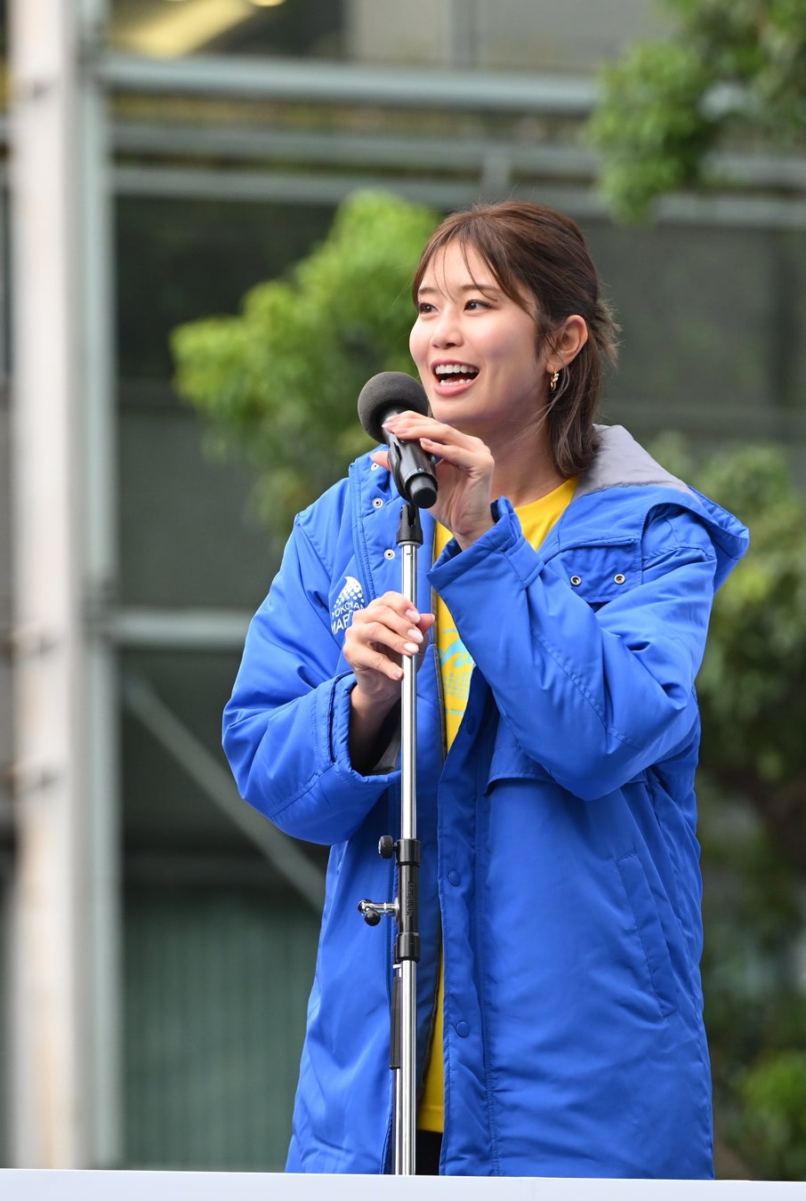 続いて、応援ゲストの谷原章介さんが「皆さん、おはようございます! 昨日は我らが横浜DeNAベイスターズがソフトバンク相手に熱い戦いを最後まで諦めずに繰り広げてくれました。皆さんも今日の『横浜マラソン』を最後まで諦めずに楽しんでください。頑張ってください!」と、稲村亜美さんが「今、日本シリーズが行われている一番熱い街、横浜で皆さんがマラソンに挑戦されるということで私もとても楽しみですし、ベイスターズと共に、皆さんのマラソンも応援しています。私は皆さんのお見送りと迎え入れをいたしますので、今日は一日頑張ってください!」と元気よく応援メッセージを届けてくれました。