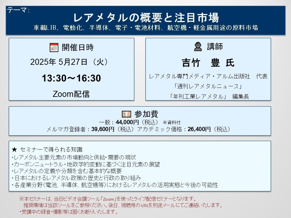 先端技術情報や市場情報を提供している(株)シーエムシー・リサーチ(千代田区神田錦町: https://cmcre.com/ )では、 各種材料・化学品などの市場動向・技術動向のセミナーや書籍発行を行っておりますが、 このたび「レアメタルの概要と注目市場 ― 車載LIB、電動化、半導体、電子・電池材料、航空機・軽金属用途の原料市場」と題するセミナーを、 講師に吉竹 豊 氏 (レアメタル専門メディア・アルム出版社 代表/「週刊レアメタルニュース」「年刊工業レアメタル」 編集長)をお迎えし、2025年5月27日(火)13:30より、 ZOOMを利用したライブ配信で開催いたします。 受講料は、 一般:44,000円(税込)、 弊社メルマガ会員:39,600円(税込)、 アカデミック価格は26,400円(税込)となっております(資料付)。