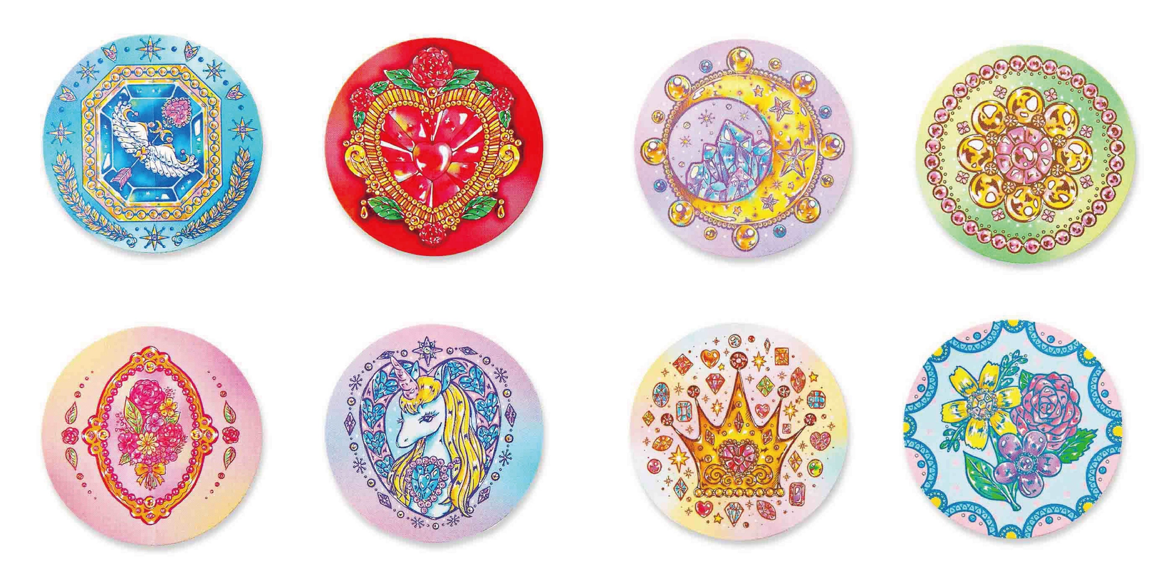 フレークシールのデザインは、「魔法部 ときめく花の香りを手のひらに 変身コンパクト風ハンドクリーム」に引き続き、アクセサリーデザイナー「マルべリコ」とコラボレーションしています。ハンドクリームのデザインの〈cupid〉〈heart〉〈moon〉に加え、新たに5種類のデザインが描き下ろされ、どの柄にも、ときめく要素がちりばめられた乙女心をくすぐるデザインに仕上がっています。直径約3.5cmで存在感のあるサイズ感で、全8種類各4枚の32枚入りでたっぷりと楽しめます。
