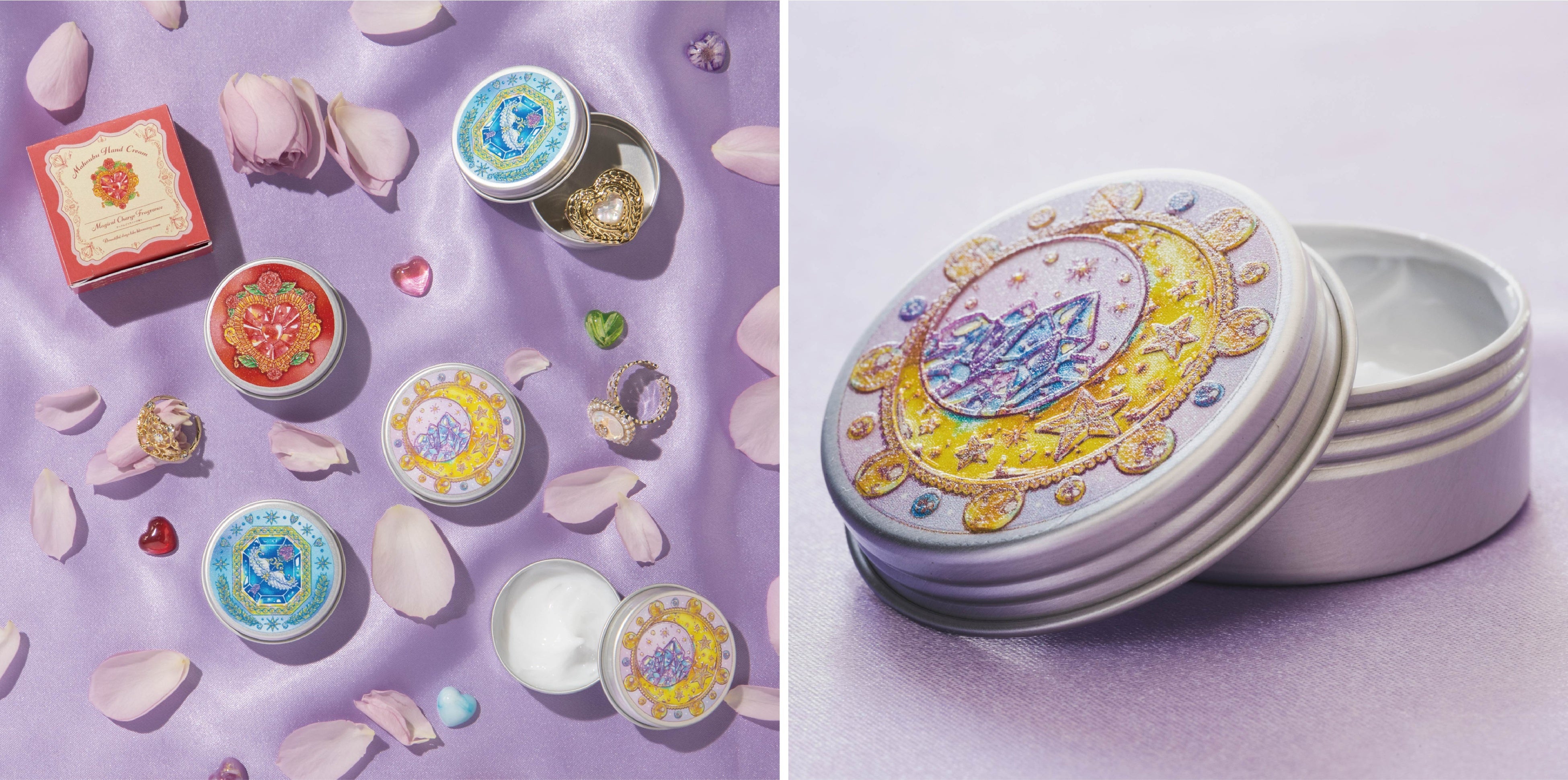 画像左:「魔法部 ときめく花の香りを手のひらに 変身コンパクト風ハンドクリーム」、画像右:「魔法部 ときめきを思いのままに 変身コンパクト風フレークシール」