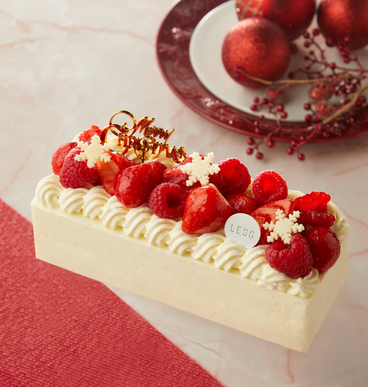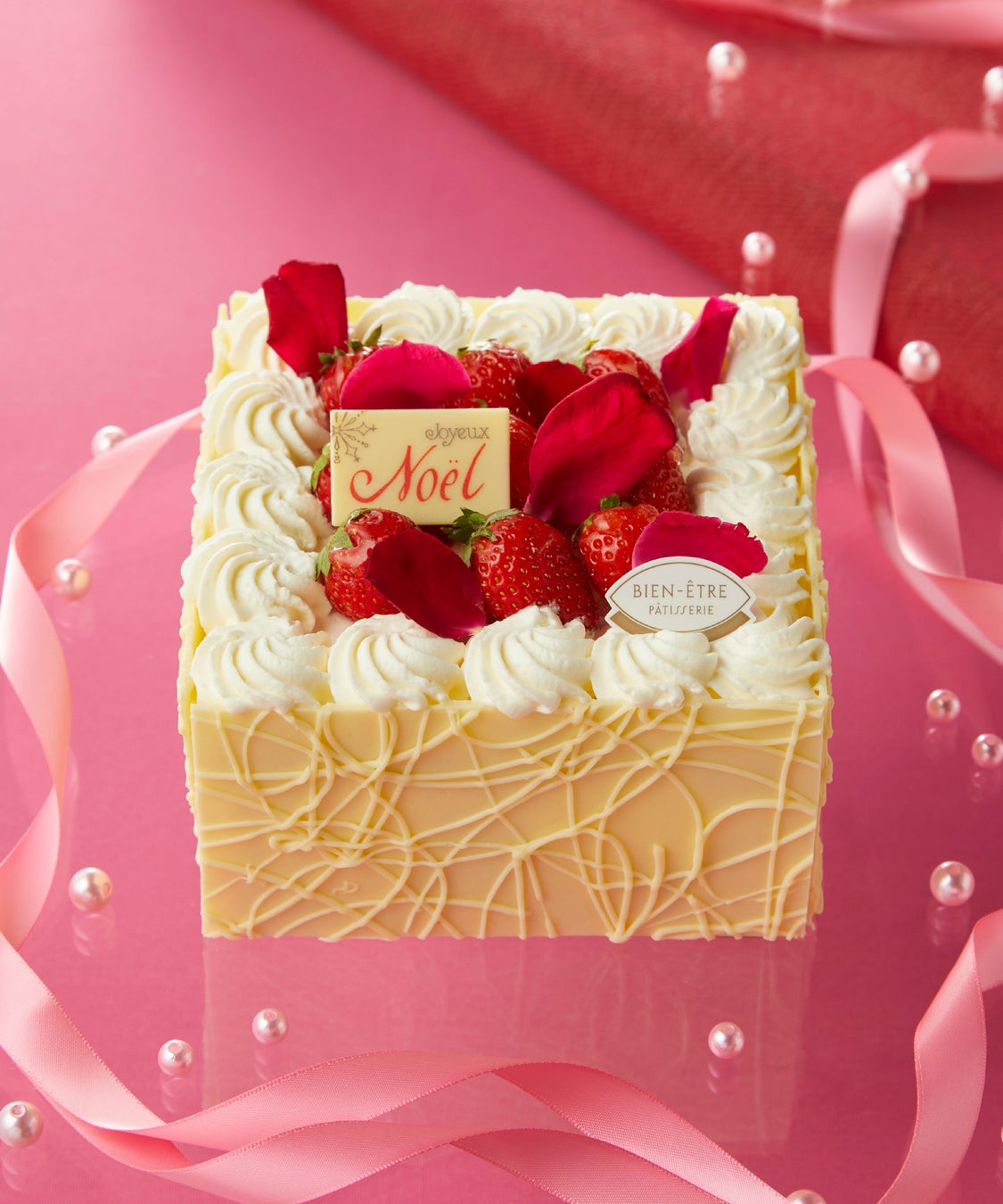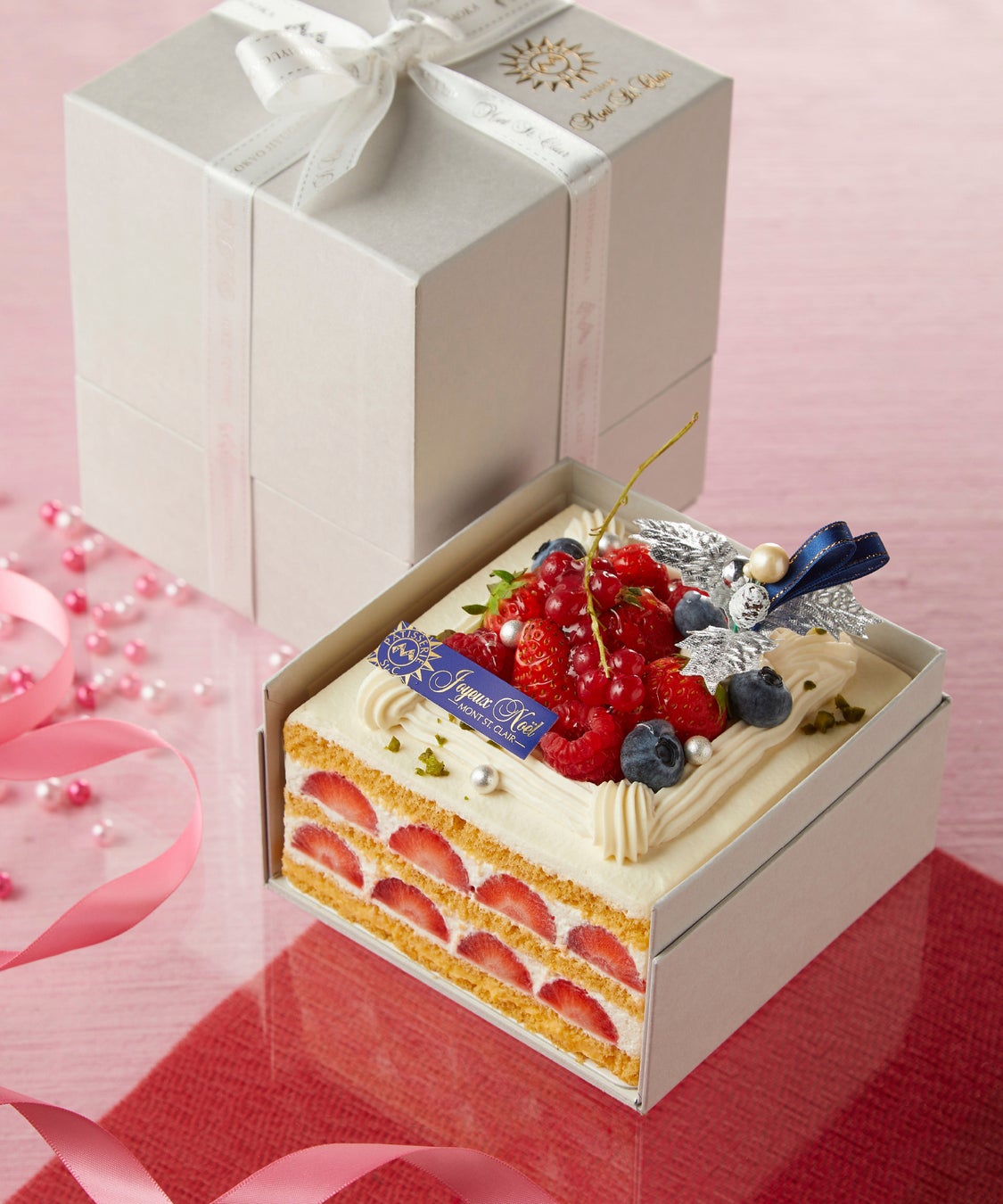 オーガニックバニラを原料にしたジェノワーズ、味わいや⼝溶けの異なる独⾃ブレンドの2種類のクリームを使⽤したいちごのみずみずしさや⽢さが引き⽴つショートケーキです。ジェノワーズにはローズシロップを染み込ませ、クリスマス限定アントルメに仕上げました。ギフトボックスをイメージしたデザインが特別感を⾼めます。