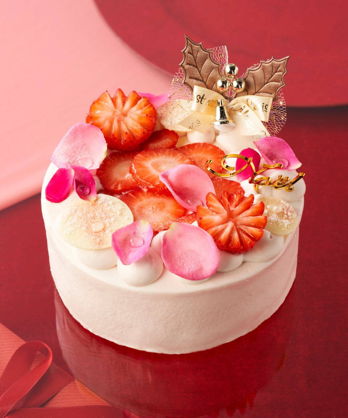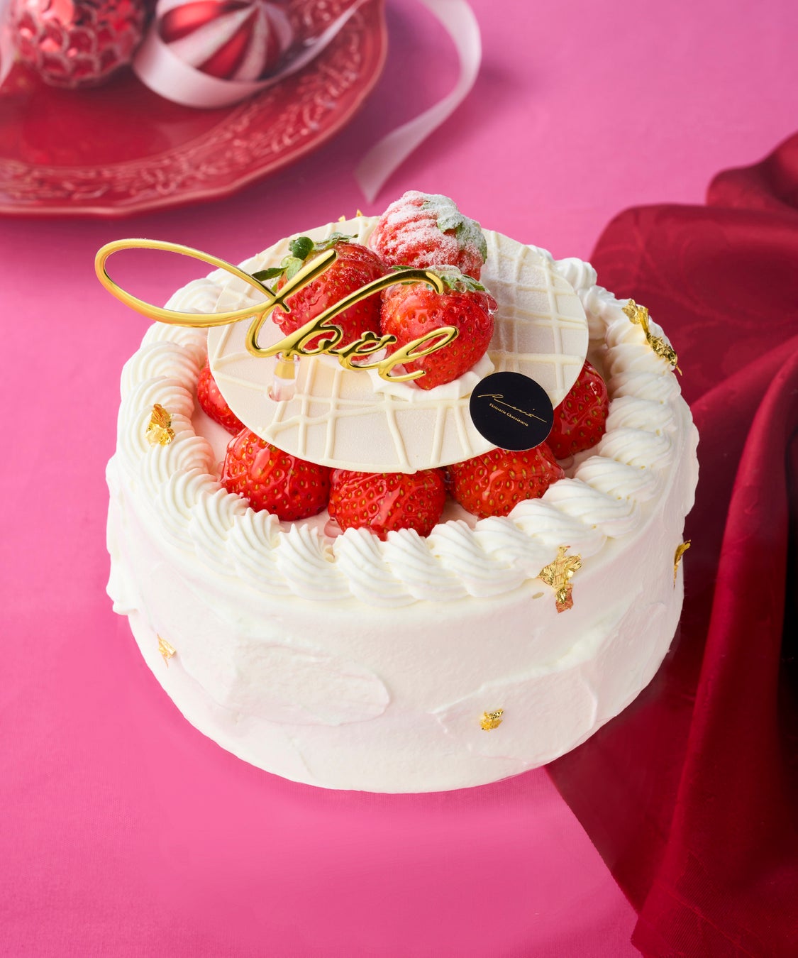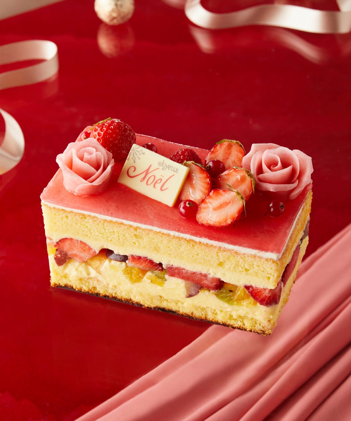 オーガニックバニラを原料にしたジェノワーズ、味わいや⼝溶けの異なる独⾃ブレンドの2種類のクリームを使⽤したいちごのみずみずしさや⽢さが引き⽴つショートケーキです。ジェノワーズにはローズシロップを染み込ませ、クリスマス限定アントルメに仕上げました。ギフトボックスをイメージしたデザインが特別感を⾼めます。