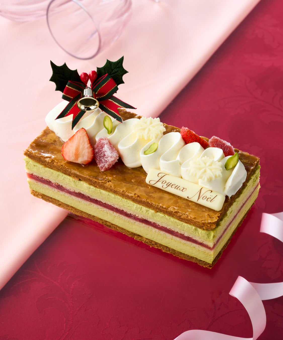 <フレデリック・カッセル>で⼈気のミルフイユをクリスマス仕様にドレスアップ。フランス産の⼩⻨粉とAOP発酵バターを使⽤して焼き上げたフィユタージュに、なめらかなピスタチオペースト、マスカルポーネチーズを配合したクリーム、⽢酸っぱいいちごのジュレ、ビスキュイ・ジョコンドを重ねました。断⾯の⾚とグリーンはクリスマスカラーのリボンを表現しています。