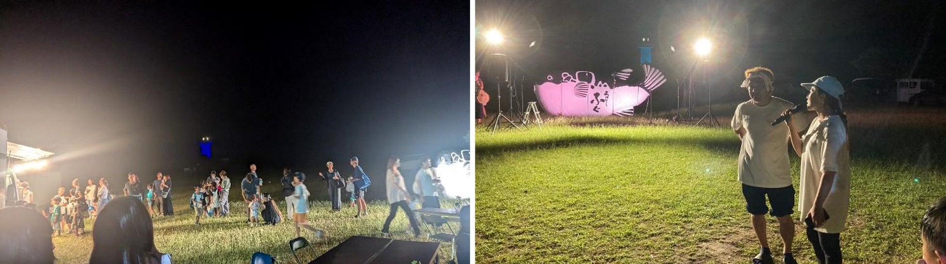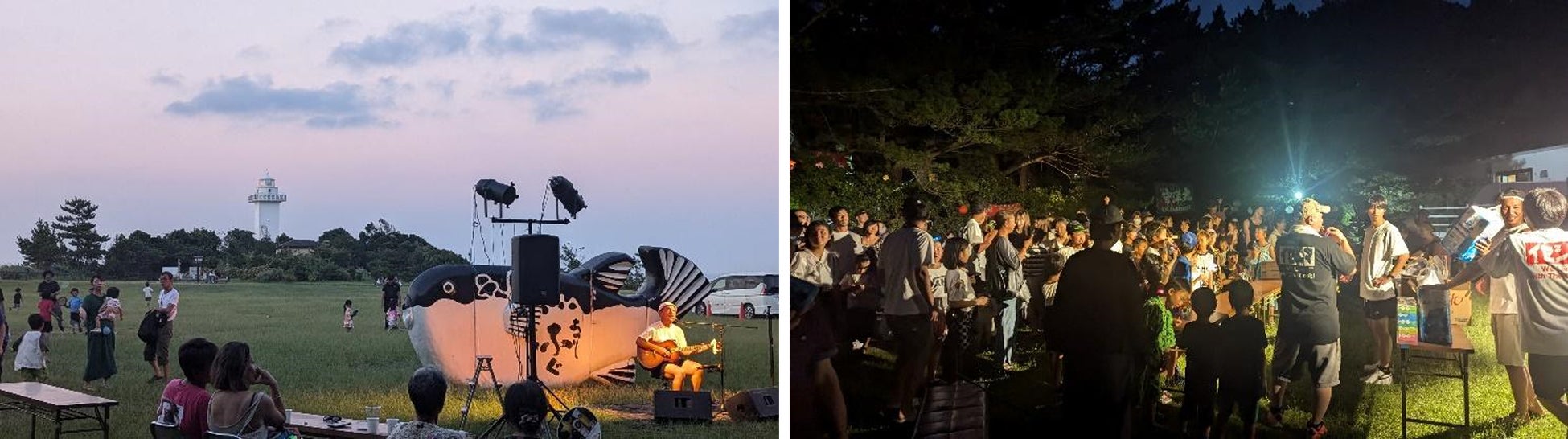 灯台クイズは、全8問の難問に挑戦する形式で行われ、灯台の歴史や構造に関する知識が試されました。参加者の中には全問正解者も現れ、会場は大きな盛り上がりを見せました。また、地元アーティストによる歌の披露も。美しい歌声が灯台ライトアップと相まって幻想的な雰囲気を醸し出し、来場者を魅了しました。