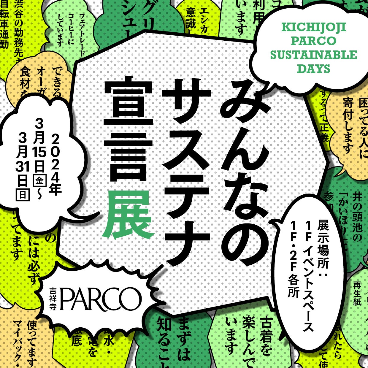株式会社パルコ(本部:東京都渋谷区)が運営する吉祥寺PARCOでは、サステナビリティにまつわるイベントやワークショップ、ポップアップショップを開催するキャンペーン「みんなのサステナ宣言展 KICHIJOJI PARCOSUSTAINABLE DAYS」を2024年3月15日(金)から31日(日)まで開催します。