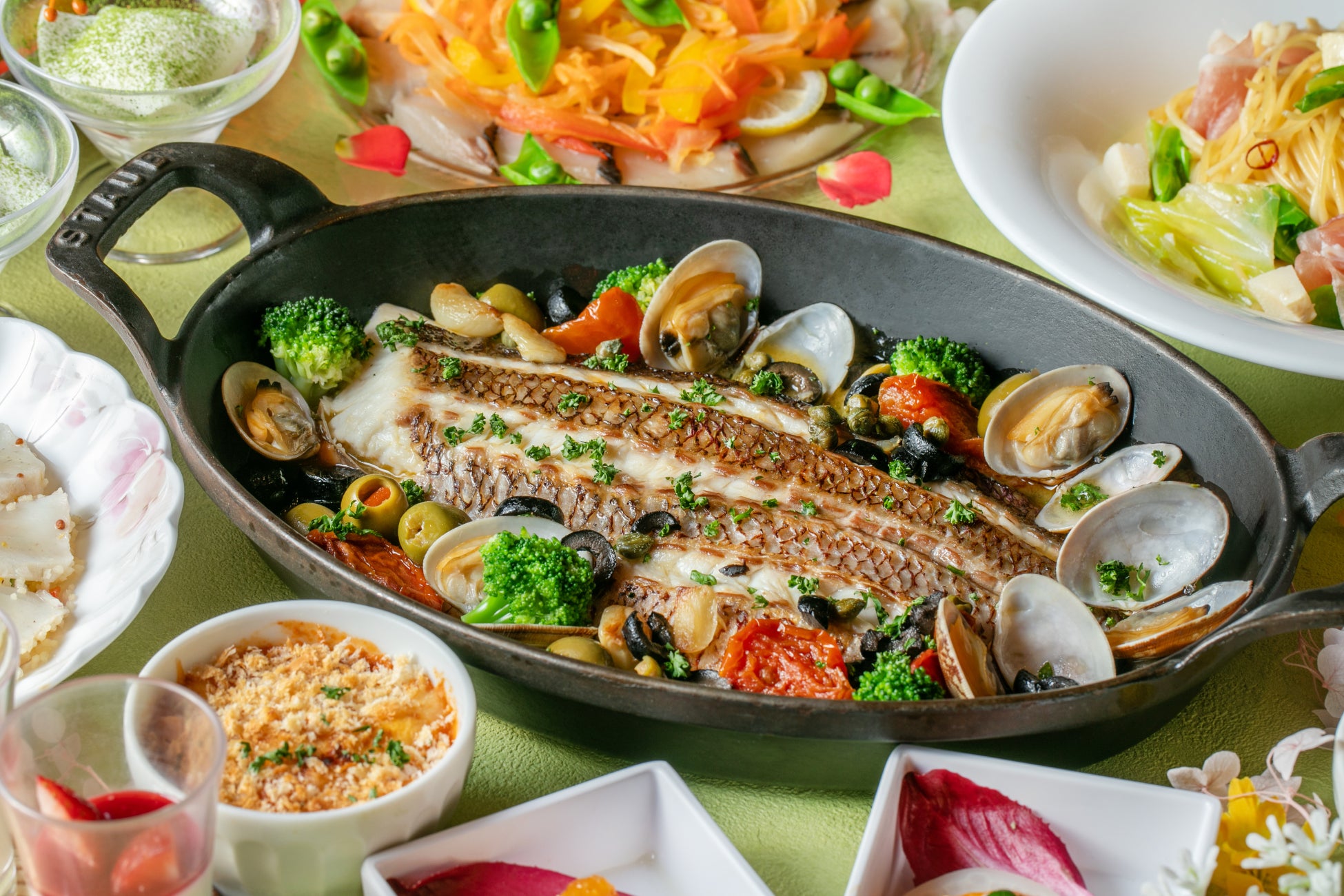 『桜鯛』は「桜鯛のマリネとタブレサラダ」や「桜鯛とあさりのアクアパッツァ」にアレンジしてご提供。爽やかな風味と旨味をご堪能いただけます。春野菜では「春キャベツと筍、生ハムのアーリオオーリオ」や「冷製空豆のフランとソイフード」をご用意。春野菜の甘みや香りと共に春の味わいをお届けいたします。