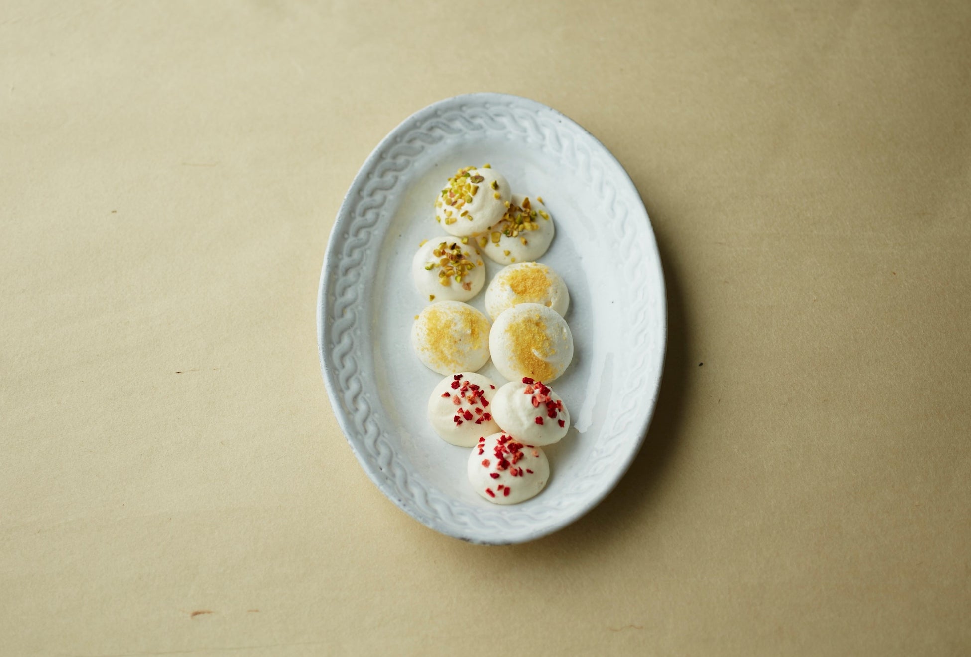 カステラの製造過程で余分となる卵白を活用しフードロスの削減にも繋がる商品。プレーン(黄色)・いちご(赤)・ピスタチオ(緑)の3色で見た目もかわいらしいメレンゲクッキーです。