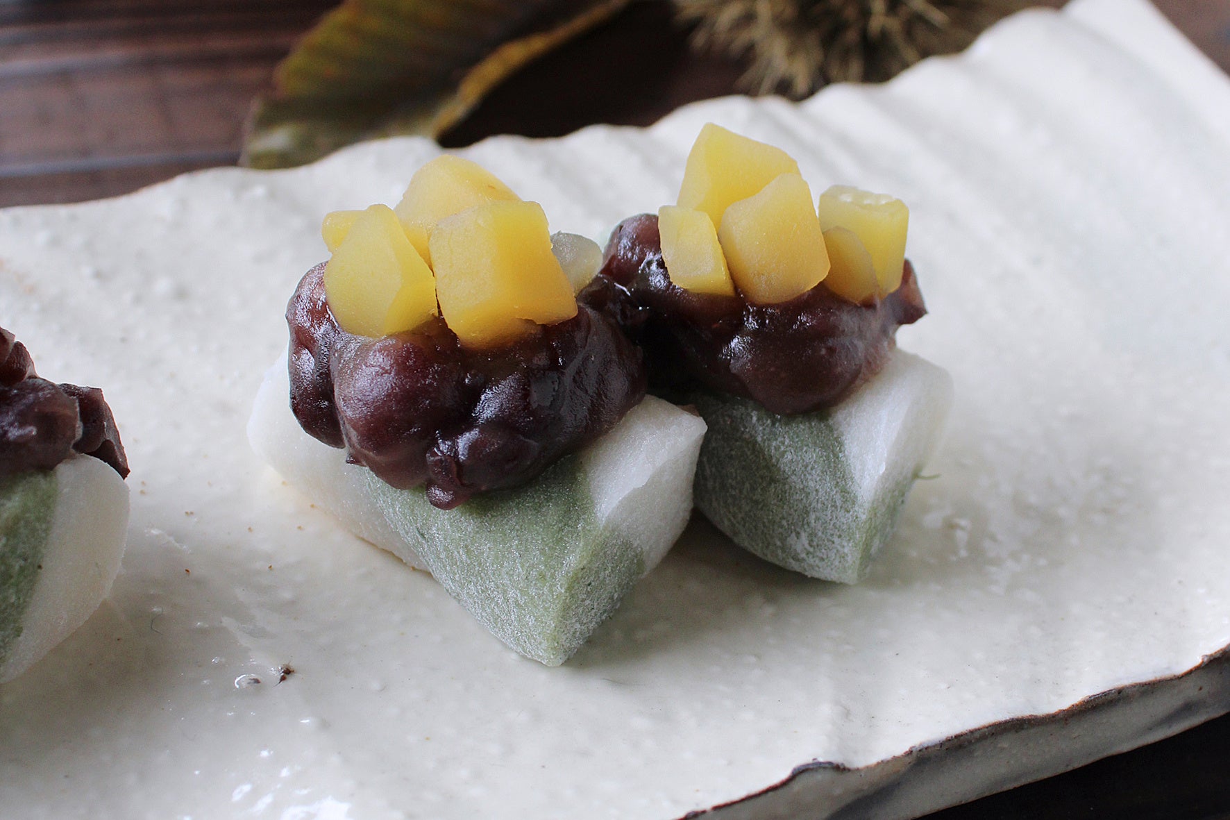 石山寺名物「石餅」の季節・店舗限定商品。絆を表す白と蓬のねじり餅に、石に見立てた小豆の上に、さらに割れ栗をたっぷりのせた秋の味覚です。
