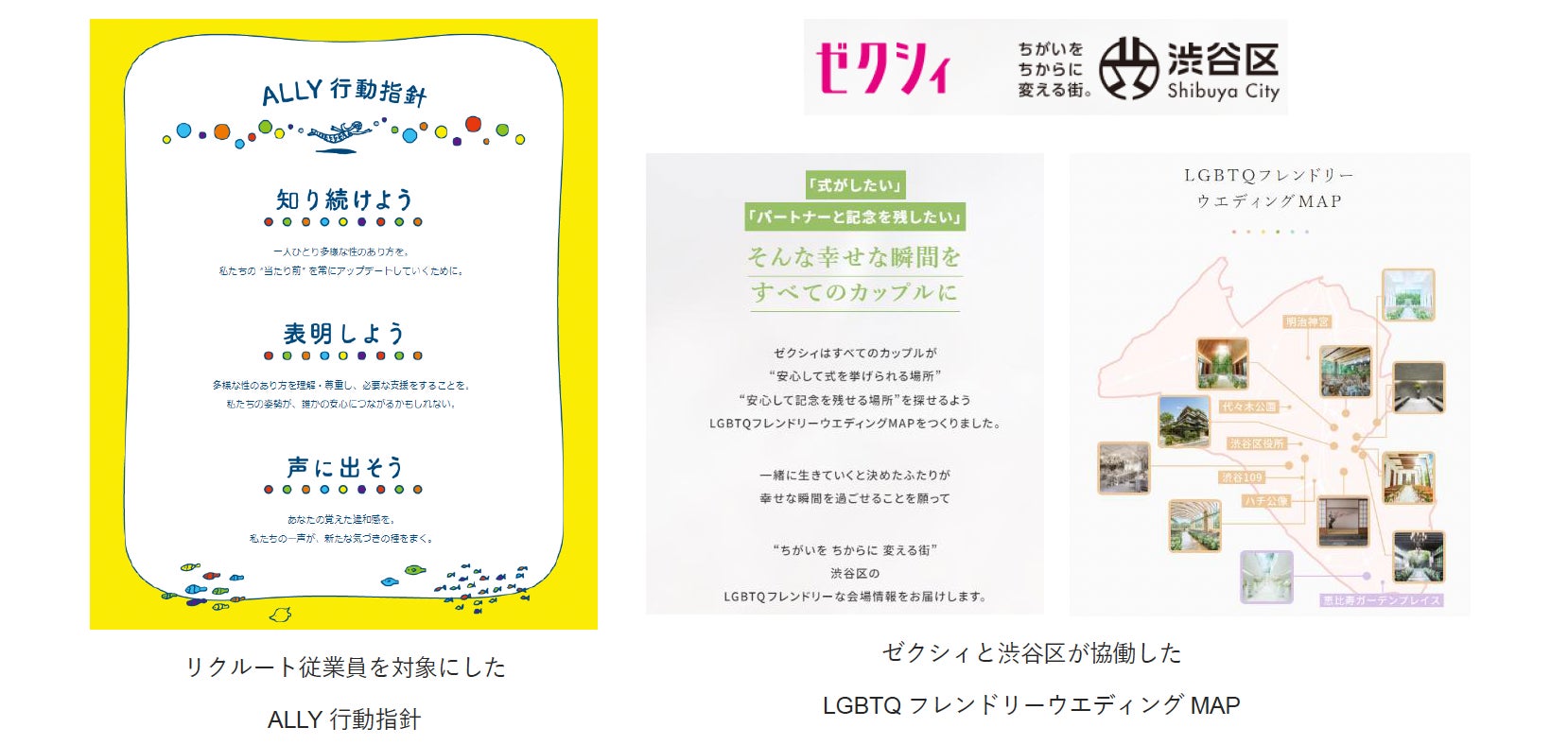 2023年には、日本国内における婚姻の平等に賛同する企業を募るキャンペーン「Business for Marriage Equality」への賛同を表明しました。また、『ゼクシィ』では、渋谷区やクライアント企業と協働し作成した「LGBTQフレンドリーウエディングMAP」、ブライダル業界で働く方々に向けたセクシュアルマイノリティへの理解促進研修動画の配信等を通じて、クライアント企業、一般カスタマー、ブライダル業界をはじめとする社会全体の変化に貢献することを目指しています。