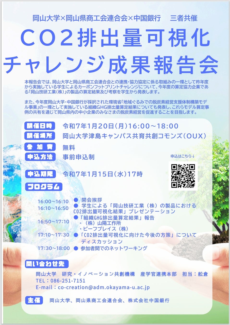 国立大学法人岡山大学(本部:岡山市北区、学長:那須保友)は、岡山県商工会連合会、中国銀行との共催により、2025年1月20日(月)にCO2排出量可視化チャレンジ成果報告会を本学津島キャンパスにある共育共創コモンズ(OUX)で開催いたします。