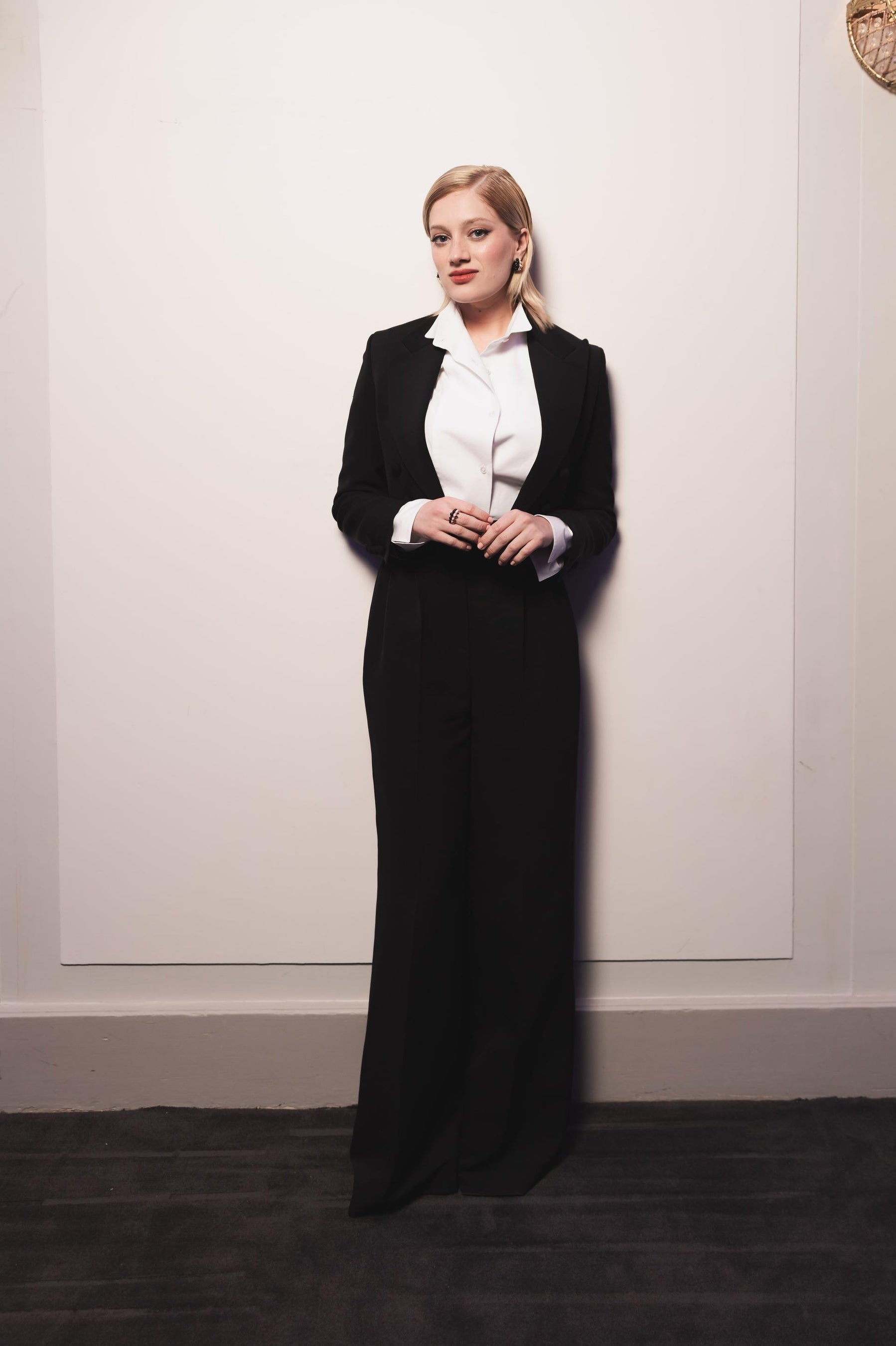 ナディア・テレスキウィッツは、ブラックウールとシルクのスーツに、ホワイトコットンシャツを着用しました。