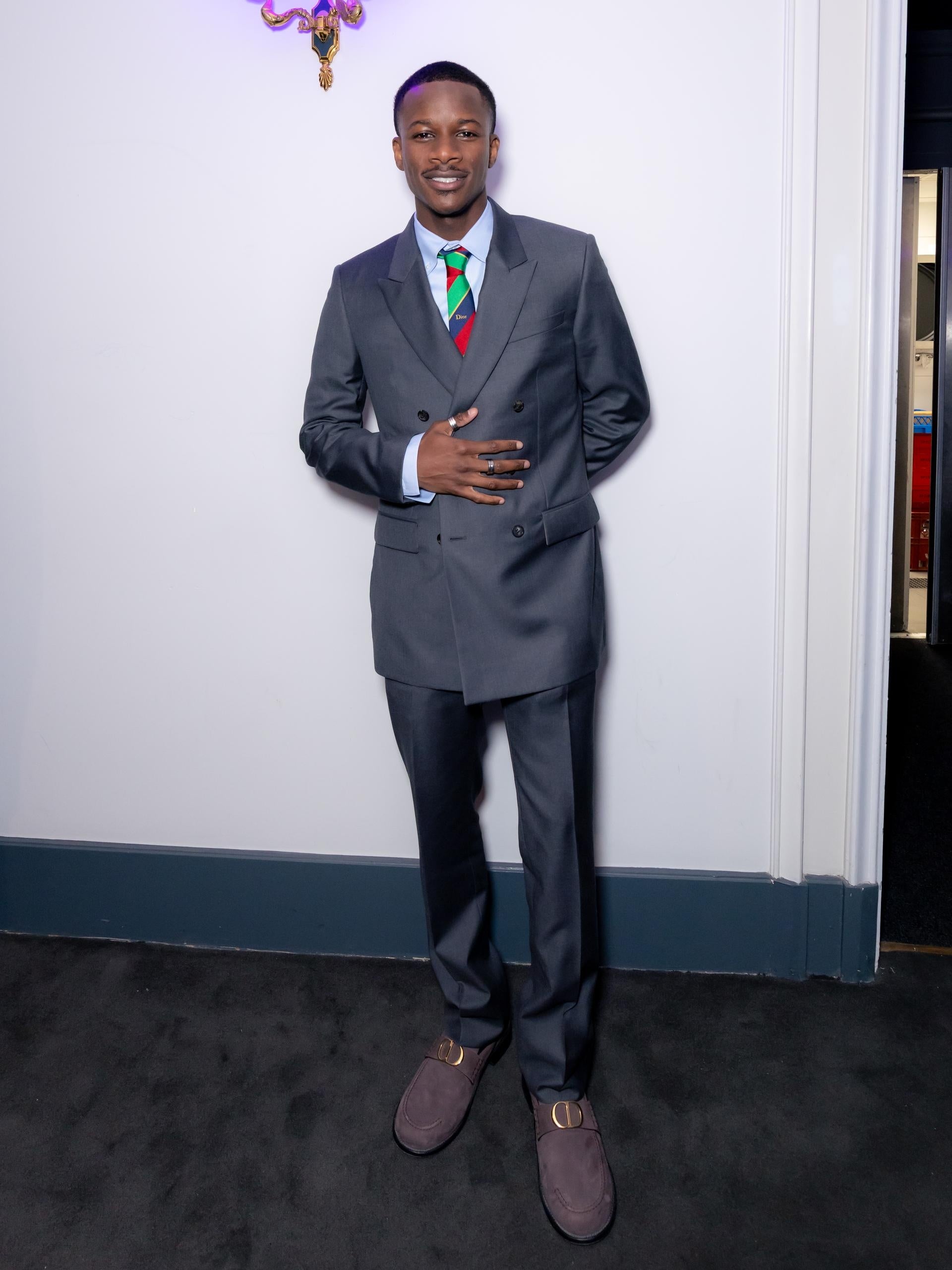 ママドゥ・シディベは、グレーウールのピークドラペルダブルブレストスーツに、ブルーのコットンシャツ、グリーンとブルーのシルクストライプネクタイを合わせました。また、ブラウンレザーのローファーを着用しました。