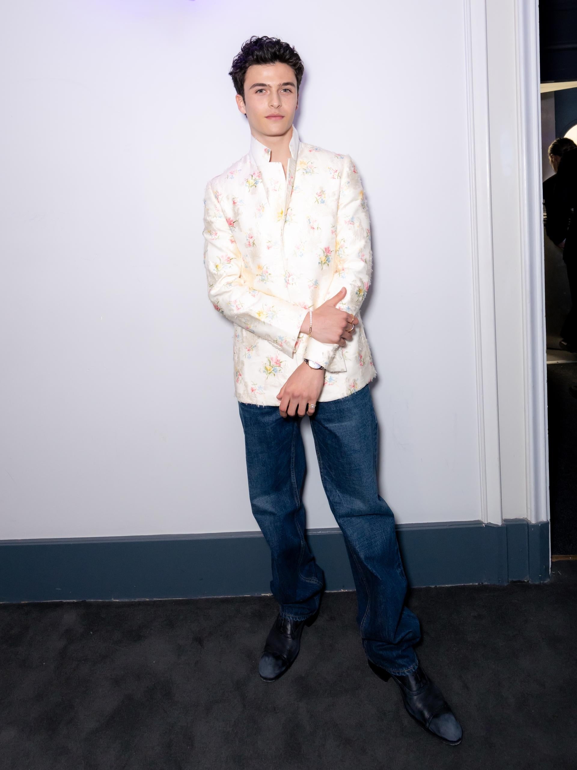 マリック・フリッカーは、フラワーの刺繍があしらわれたホワイトのジャケットとブルーのデニムジーンズを着用していました。また、ネイビーレザーのダービーシューズを合わせました。
