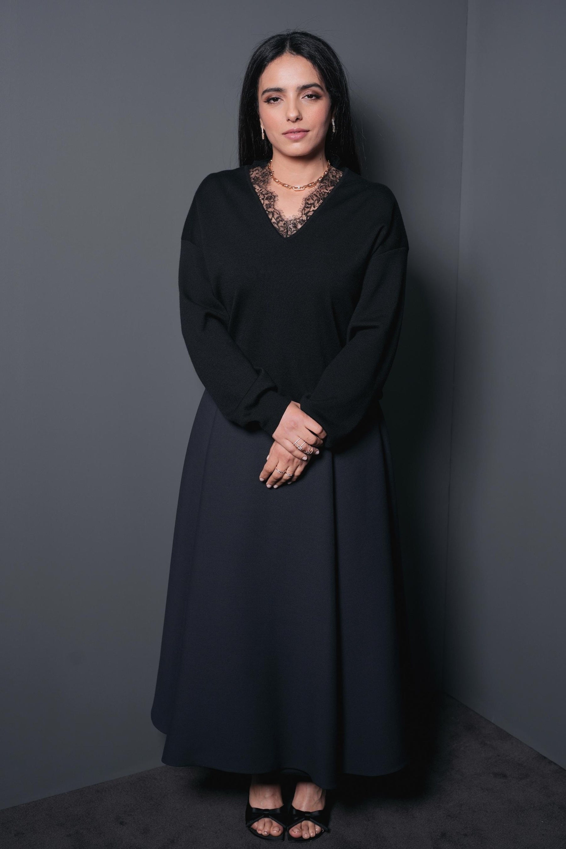 アフシア・エルジは、レースがあしらわれたブラックウールのセーターに、ブラックウールとシルクのスカートを合わせていました。シューズもディオールです。