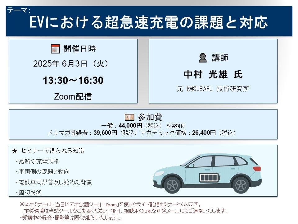 先端技術情報や市場情報を提供している(株)シーエムシー・リサーチ(千代田区神田錦町: https://cmcre.com/ )では、 各種材料・化学品などの市場動向・技術動向のセミナーや書籍発行を行っておりますが、 このたび「EVにおける超急速充電の課題と対応」と題するセミナーを、 講師に中村 光雄 氏 (元 (株)SUBARU 技術研究所)をお迎えし、2025年6月3日(火)13:30より、 ZOOMを利用したライブ配信で開催いたします。 受講料は、 一般:44,000円(税込)、 弊社メルマガ会員:39,600円(税込)、 アカデミック価格は26,400円(税込)となっております(資料付)。