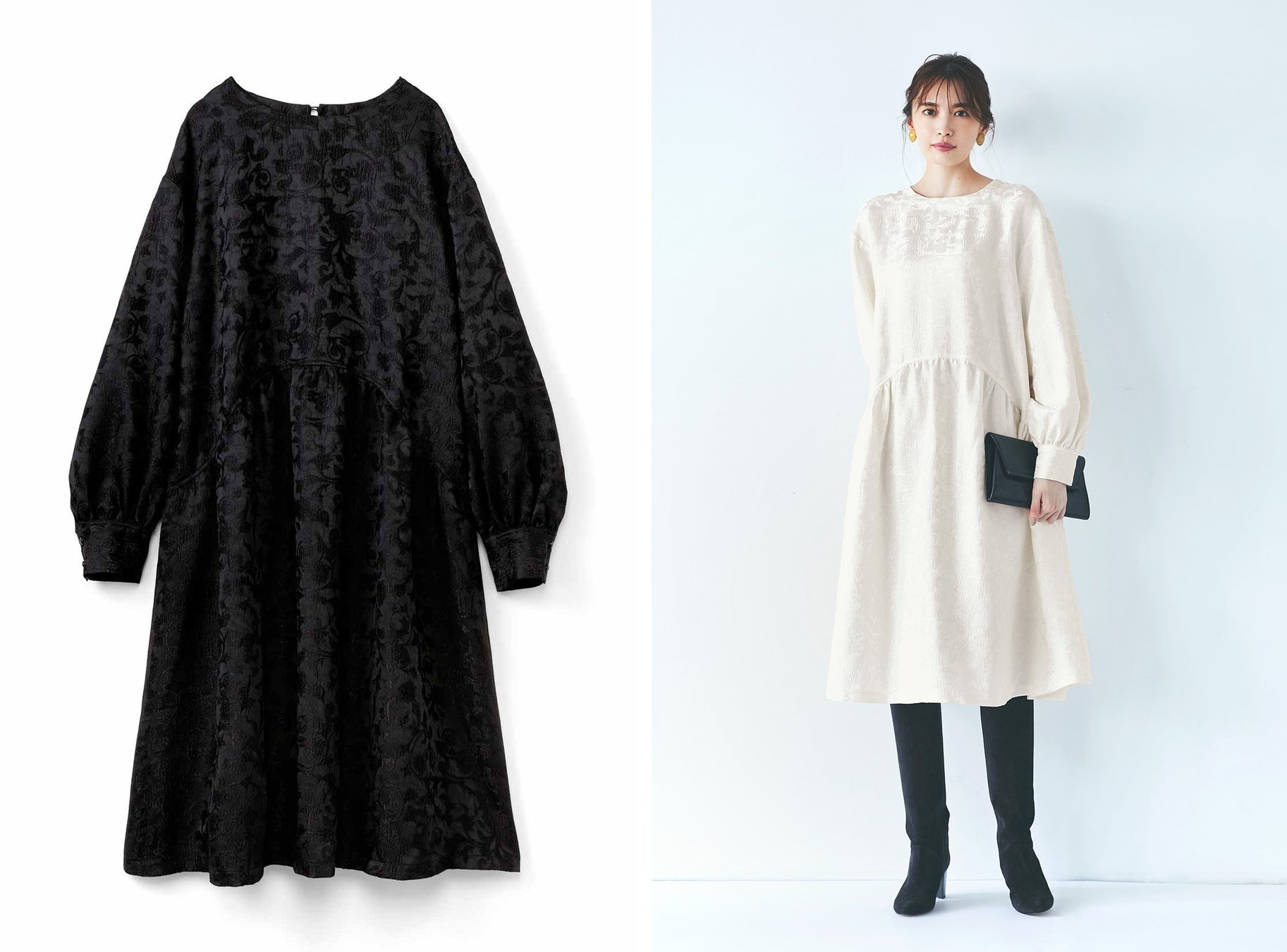 光沢のある植物柄が華やかなジャカード素材で、モードなデザインに昇華させたワンピースです。ゆったりシルエットに、ラウンドして切り替えたウエスト下のギャザーでボリューミーな甘さをプラスしています。ふだんはもちろん、セレモニーにも着用できます。