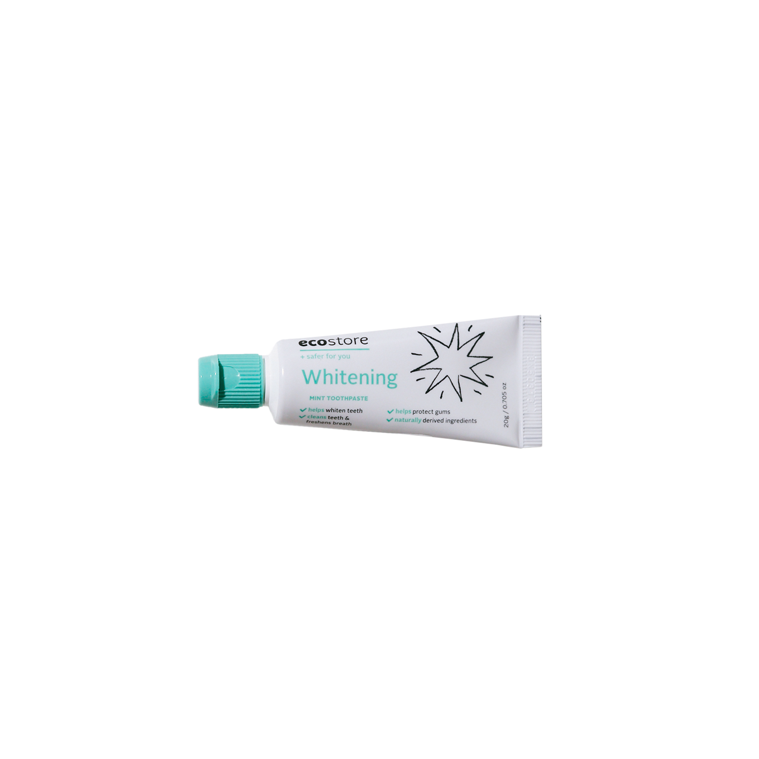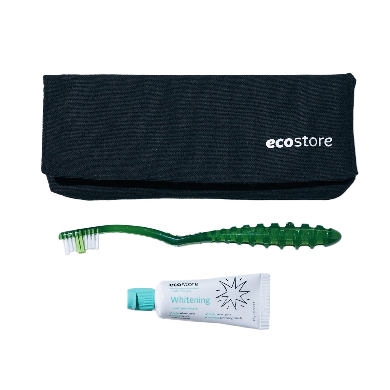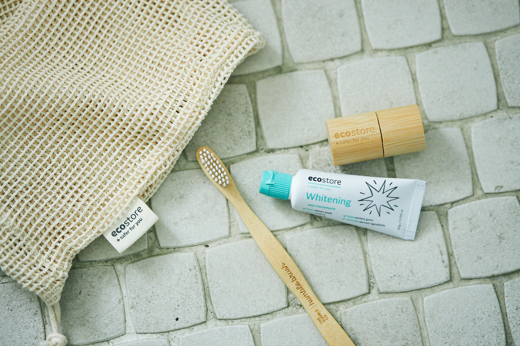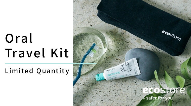 【ecostore(エコストア)】数量限定、初のトラベルキットが登場!ホワイトニングミニ 歯磨き粉とエコ素材デンタルブラシがセットになりオーガニックコットンのポーチつきで新発売