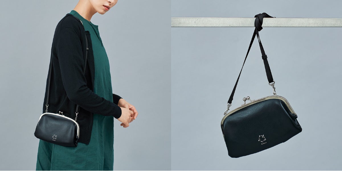 パチンと大きく開くがま口タイプのお財布ショルダーバッグです。スマホも入れられるため、手ぶらでお出かけするときや、リュックを持ち歩くときに貴重品をひとまとめにできて便利です。本革の端材を粉砕して再利用したリサイクルレザーで、高級感のある落ち着いた質感が特徴です。