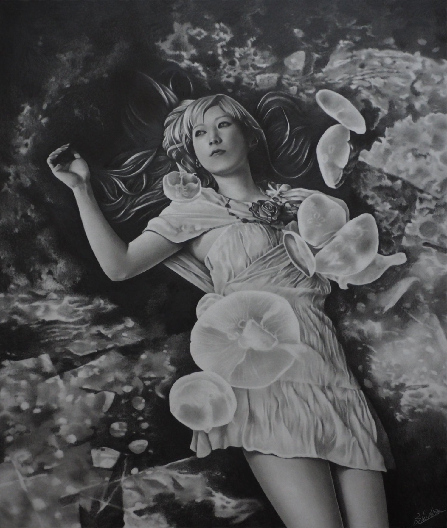 1993年に生まれ、尾道市立大学芸術文化学部美術学科日本画専攻を卒業。鉛筆画作品を主に、退廃的な世界をテーマに作品制作を行う。