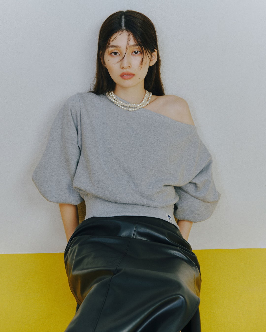 カジュアルなスウェットを、オフショルダーとパフスリーブで抜け感のあるデザインに仕上げ、