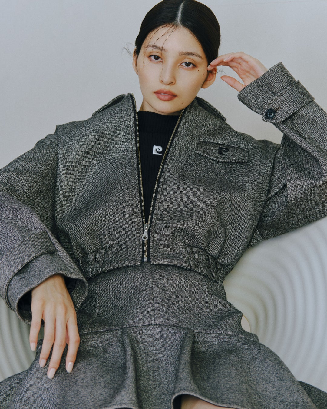 立体的なフォルムとフロントジップデザインがモードな印象のツィードジャケット。