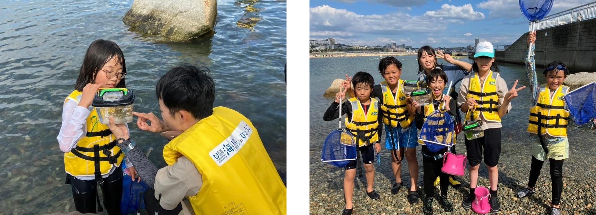 田代 敦士さん(大蔵海岸管理事務所 所長)森田 博子さん(大蔵海岸管理事務所)より、危険な生き物を教わり、注意しながら磯浜の生き物を採って観察しました。スズメダイの稚魚やカニ、ヤドカリなど、色々な生き物を見つけました。子どもたちはさかなのおにいさん かわちゃん(プロジェクトリーダー)のところへ採った生き物を「これは何ですか?」と見せにいく姿が印象的でした。磯辺の生き物が育つには、海藻や植物プランクトンが重要で海藻や植物プランクトンが育つには栄養塩が重要であることを学びました。